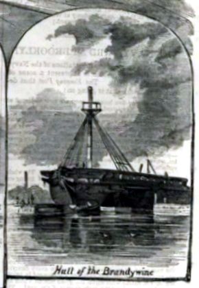 25k | Wood engraved newspaper print of Brandywine at New York Navy Yard in 1861 while being housed over and converted to a storeship.