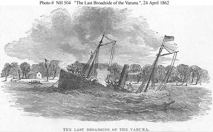 114k | Line engraving, published circa the 1860s, depicting USS Varuna continuing to fire at Confederate forces as she sank, during the battle off Forts Jackson and St. Philip, below New Orleans, Louisiana, 24 April 1862.