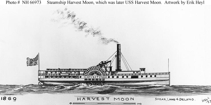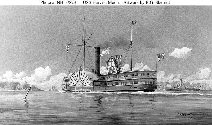 96k | Wash drawing by R.G. Skerrett, 1903, depicting USS Harvest Moon underway during the Civil War. Courtesy of the Navy Art Collection, Washington, D.C. US Naval History and Heritage Command photo # NH 57823. |