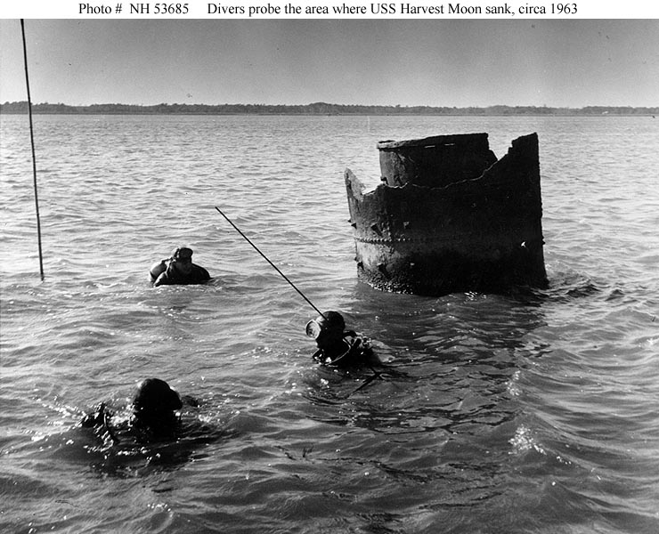 112k | SCUBA Divers use rods to probe the area of the USS Harvest Moon shipwreck, circa 1963. Note the remains of her smokestack nearby. Courtesy of Walter McDonald. US Naval History and Heritage Command photo # NH 53685 |