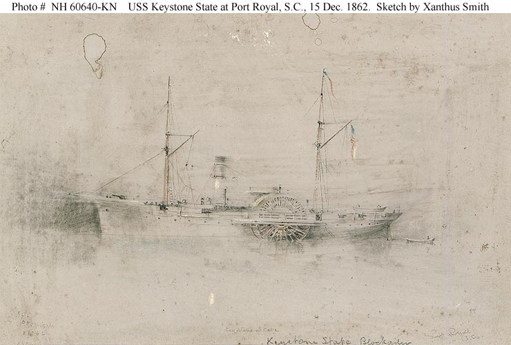 67k | Colored pencil sketch by Xanthus Smith of USS Keystone State, depicting the ship at Port Royal, South Carolina, 15 December 1862.