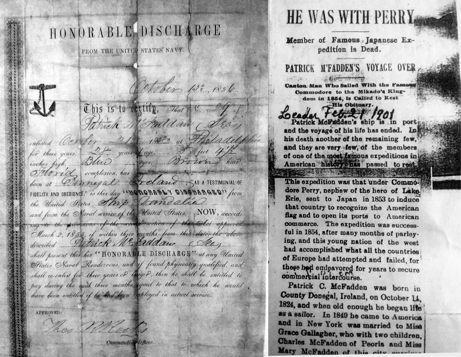 Patrick C. McFadden (1824-1901) served in Vandalia from October 1852, through October 1856. He was a native of the area of Kilcar, County Donegal Ireland. His Honorable Discharge from Vandalia, dated October 1856 was given at Kittery, Maine. McFadden received his Citizenship in Norwich, CT. in 1867. He lived in New York City, and retired to Canton, IL. in 1874, and died there in February, 1901. His obituary states he was witness to the opening of Japan during the Matthew G.Perry Expedition, and also posted for 11 months in Shanghai, China with detached duty to the US Consulate with 25 other enlisted men and Officers, which is noted in his sworn Pension Application dated 1898. |