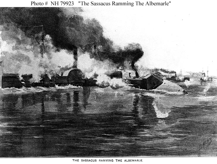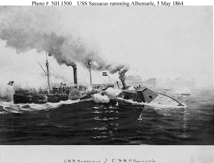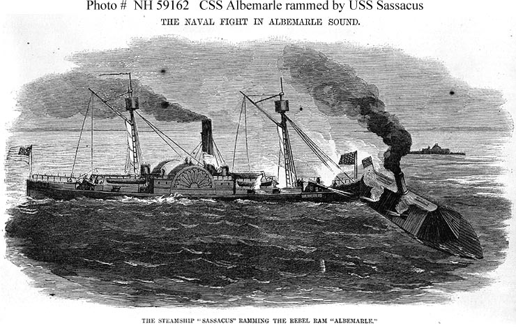Sassacus was hit in a boiler and disabled during this action. Albemarle was not significantly damaged by the ramming or by gunfire. US Naval History and Heritage Command photo # NH 1500. |