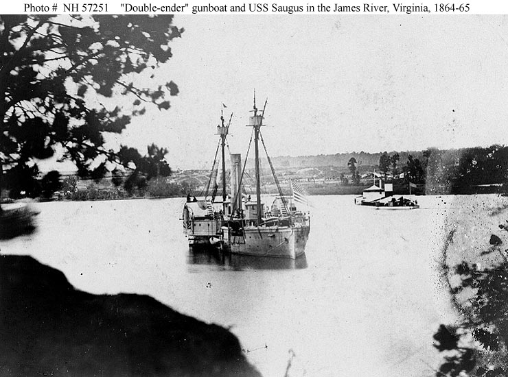 in the James River, Virginia, 1864-65. Originally identified as USS Agawam. This ship differs from her in detail. It has been