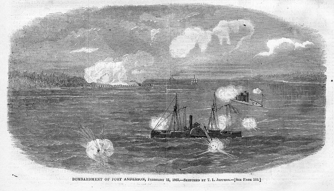 371k | Wood-cut engraving "BOMBARDMENT OF FORT ANDERSON", published in "Harper's Weekly" March 1865. Bombardment of Fort Fisher by USS Huron, USS Monitor and USS Montauk. |