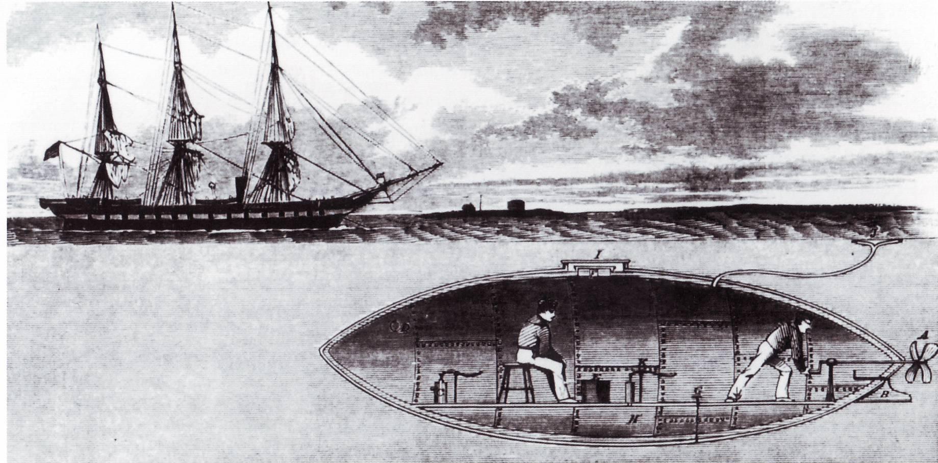 280k | Image from Harper's Weekly depicting one of the Cheeney-designed, Richmond-built, Confederate submarines, attempting to attack the steam frigate USS Minnesota, flagship of Federal squadron blockading the mouth of the James River, in early October 1861. Photo courtesy of Straford Archive. |