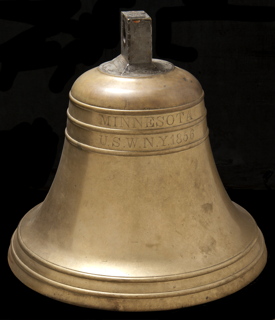291k | The cast brass bell from USS Minnesota. The bell is engraved with "Minnesota U.S.W.N.Y 1856". Photo courtesy of the Minnesota Historical Society. |