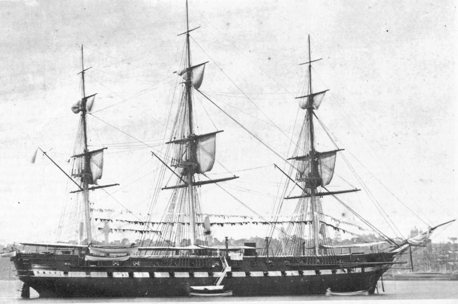 241k | USS Minnesota as she appeared in 1871. Note the trim, compact lines, the guns in open gun ports. US National Archives photo. Photo and text from"Warships of The Civil War Navies" by Paul H. Silverstone. |