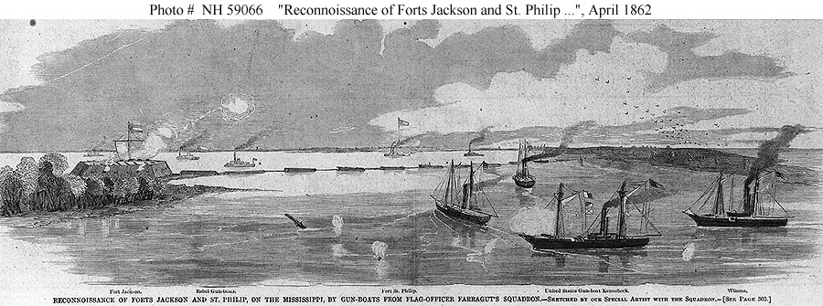 118k | "Reconnaissance of Forts Jackson and St. Philip, on the Mississippi, by Gun-boats from Flag-officer Farragut's Squadron" Line engraving published in "Harper's Weekly", 1862, depicting the attack on the obstructions below the forts, 20 April 1862. US Navy gunboats shown in right center are USS Itasca and USS Pinola. Further to the right are USS Kennebec and USS Winona. Fort Jackson is shown at far right, with Confederate gunboats beyond. US Naval History and Heritage Command photo # NH 59066 |