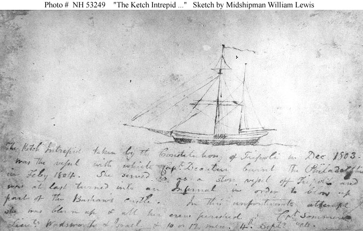 "The Ketch Intrepid taken by the Constitution of(f) Tripoli in Dec. 1803. Was the vessel with which Capt. Decatur burnt the Philadelphia in Feby 1804. She served as a store vessel off Tripoli and was at last turned into an Infernal in order to blow up part of the Bashaw's castle. In this unfortunate attempt she was blown up & all her crew perished. Cpt. Sommers, Lieuts. Wadsworth & Israel & 10 or 12 men. 4th Septr. '04." The original sketch was in the possession of Captain C.W. Cook, O.R.C.U.S.A., 1925. US Naval History and Heritage Command photo # NH 53249 |