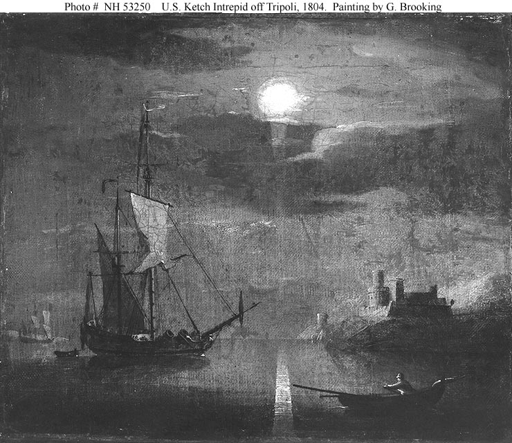 136k | 19th Century painting by G. Brooking, depicting USS Intrepid off Tripoli in 1804, illuminated by moonlight. US Naval History and Heritage Command photo # NH 53250, Courtesy of Mr. J.M. Brotherhood, 1951. |