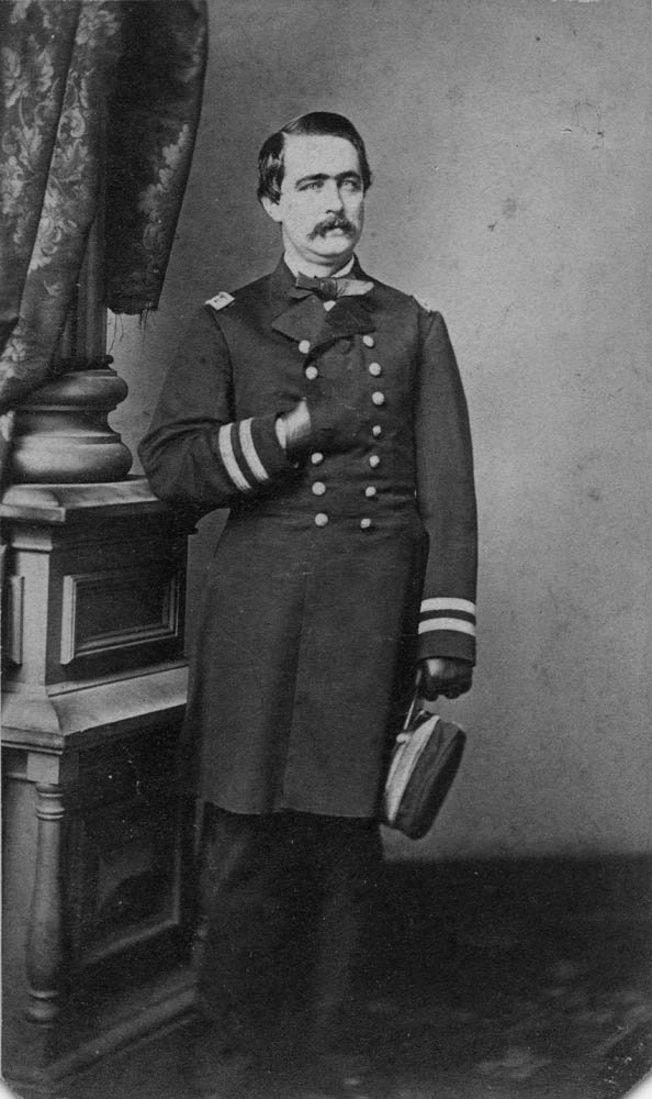 RADM. George Brown was born in Rushville, Indiana, and entered the navy as a midshipman on February 5, 1849 and graduated from the U. S. Naval Academy in 1855. He subsequently served aboard USS Cumberland and USS St. Lawrence. He served throughout the Civil War, first as inspector of ordnance for USS Powhatan (rank lieutenant), then as commander of the USS Octorara with the North Atlantic Blockading Squadron, during which time he was promoted to lieutenant commander on 16 July 1862. He especially distinguished himself on the night of February 24, 1863, when, in command of the river gunboat USS Indianola at Palmyra Island, he defended himself for an hour and a half against four Confederate gunboats. He was wounded and taken prisoner, and his vessel was destroyed. He was held at Libby Prison in Richmond, Virginia until exchanged in May 1863. He commandeered and armed the civilian vessel SS Union at Marion, Indiana for defense against Morgan's Raiders in July 1863. Later he commanded the USS Itasca at the Battle of Mobile Bay in 1864. After the war he conveyed the former CSS Stonewall to Japan, to which it had been sold. Brown remained in the navy and served in various positions; he retired on June 19, 1897, as an admiral. He died on June 29, 1913.