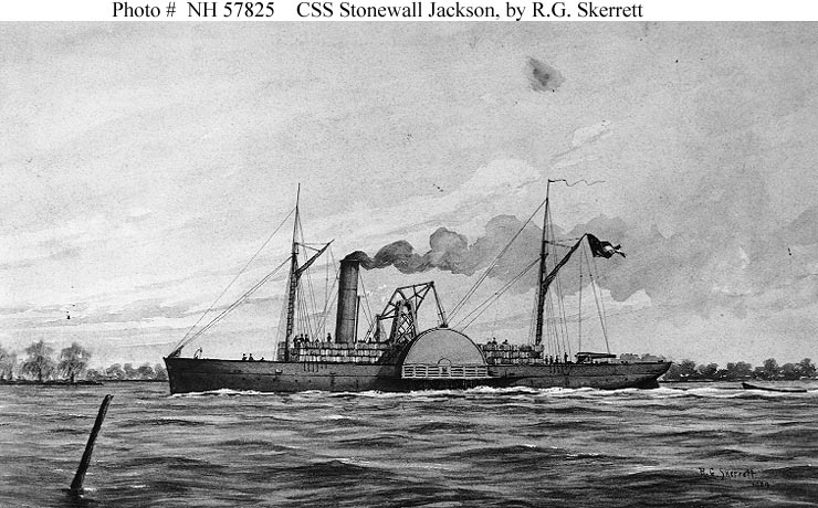 96k | Sepia wash drawing by R.G. Skerrett, 1904 of CSS Stonewall Jackson. This ship is an example of a "cotton-clad" gunboat. US Naval History and Heritage Command photo # NH 57825, courtesy of the Navy Art Collection, Washington, DC |