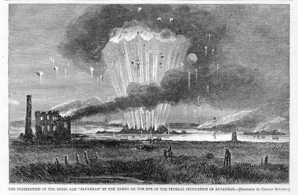 Savannah 335k Civil War wood-cut engraving titled "THE DESTRUCTION OF THE REBEL RAM, SAVANNAH BY THE ENEMY ON THE EVE OF THE FEDERAL OCCUPATION OF SAVANNAH", published in "Harper's Weekly" February 1865. Tommy Trampp