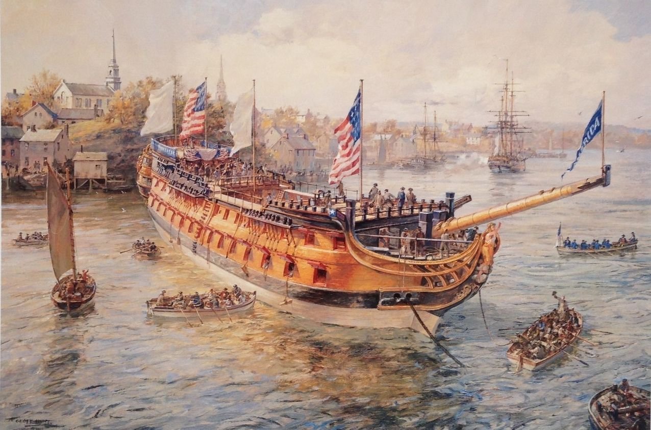 223k | Launching of America, 6 November 1782, at the John Langdon shipyard, Rising Castle Island, on the Piscataqua River, between