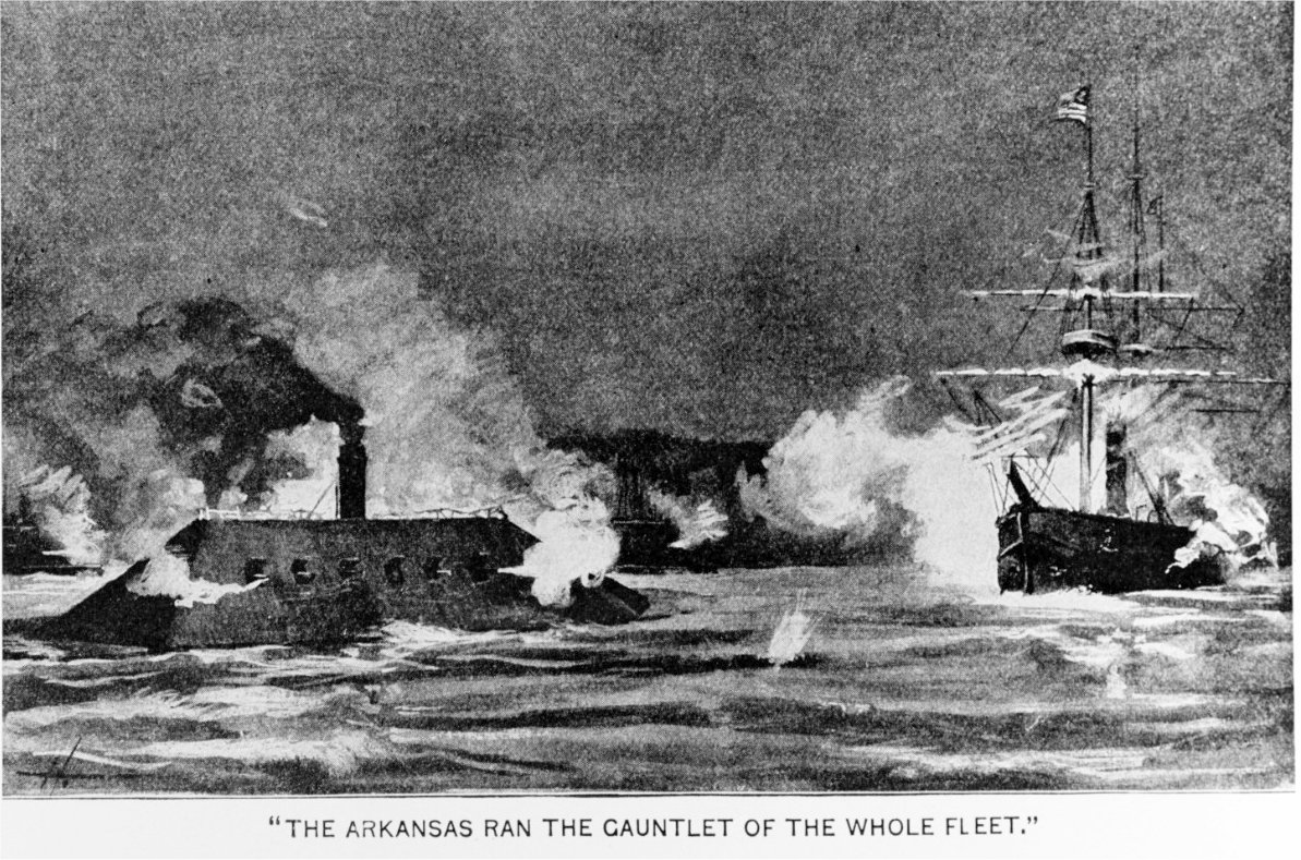 CSS Arkansas ran the "Gauntlet of the Whole Fleet" artwork published in Deeds of Valor, Volume II, page 31, by the Perrien-Keydel Company, Detroit, 1907. It depicts Arkansas during her passage through the Federal fleet above Vicksburg, Mississippi, 15 July 1862. US Naval History and Heritage Command Photo # NH 79911 |