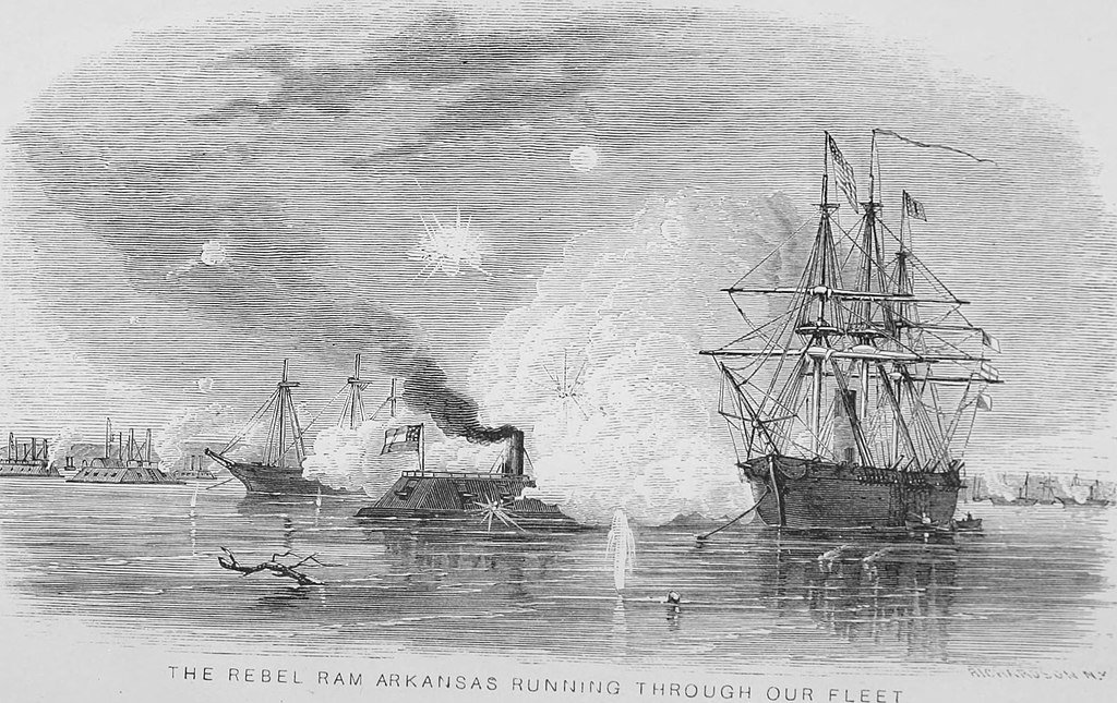 184k | CSS Arkansas running through the Union fleet above Vicksburg, Mississippi, 15 July 1862. Line engraving after a drawing by
