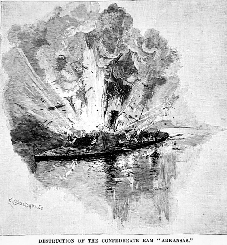 destroying the Rebel Iron-clad Ram CSS Arkansas, on the Mississippi River. Arkansas had been run ashore and burned to prevent capture when