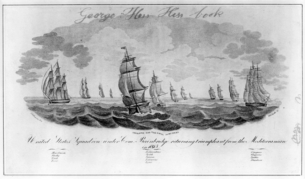 in 1815, The print shows the American squadron at sea, includes, on the left;