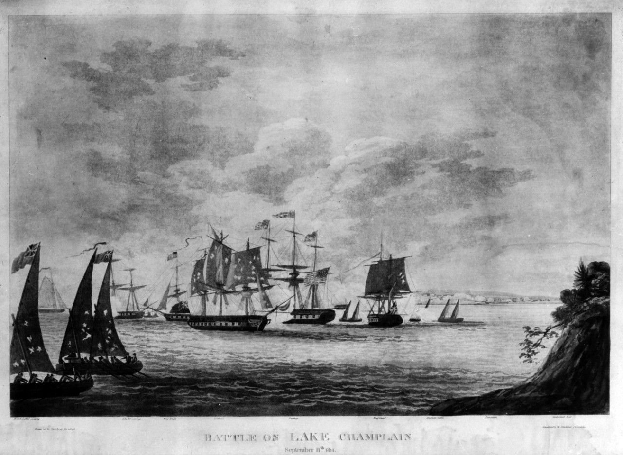 USS Ticonderoga USS Eagle; HMS Confiance; USS Saratoga; and HMS Linnet. Gunboats are also shown in action on both sides. Aquatint by W. Strickland, Philadelphia, after an eye witnesses sketch. US Naval History and Heritage Command photo # NH 63489, Courtesy of Mr. S.H.P. Pell, Fort Ticonderoga Museum, Fort Ticonderoga, New York, 1938. |