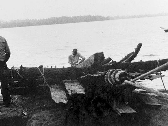 40k | The bones of Royal Savage raised from the bottom of Lake Champlain in 1934 by by marine salvor and amateur archaeologist Lorenzo Hagglund. Hagglund’s family held onto the remains of the ship and associated artifacts until being purchased by the city of Harrisburg in 1995. AP photo via Burlington Free Press. | Tommy Trampp | |