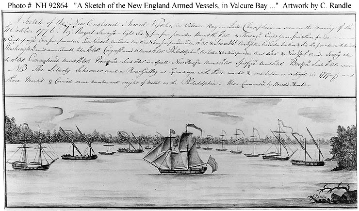 the Continental squadron, under Brigadier General Benedict Arnold, just before the Battle of Valcour Island. The vessels shown include schooner Royal Savage (center) and (from left to right