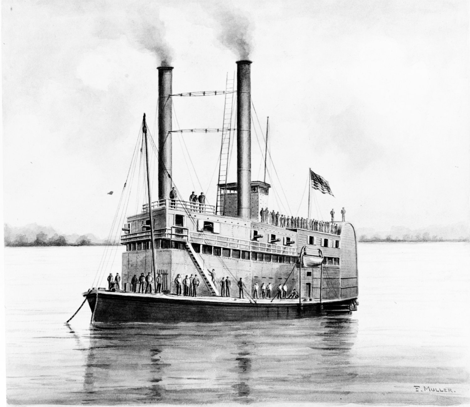 252k | Sepia wash drawing by F. Muller, circa 1900, depicting US Army Ram Switzerland on the Western Rivers during the Civil War.