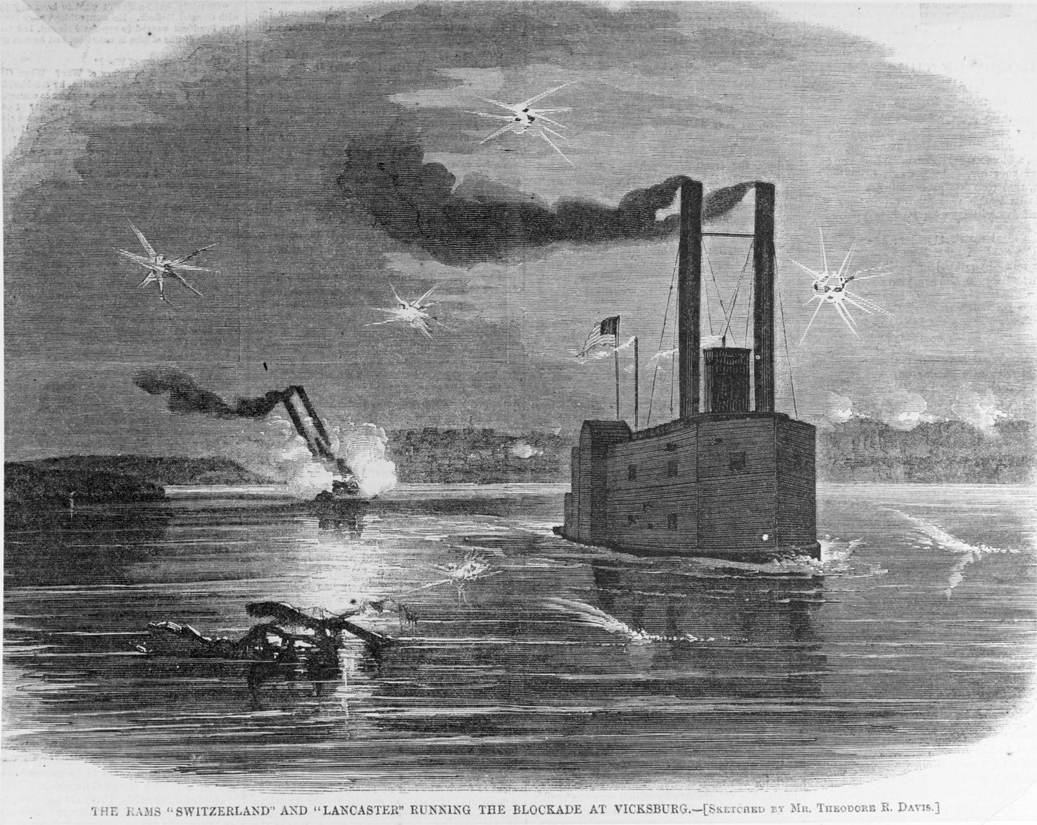 after a sketch by Theodore R. Davis, published in Harper's Weekly, 1863. In this operation, USS Switzerland (depicted here in the foreground) was disabled by