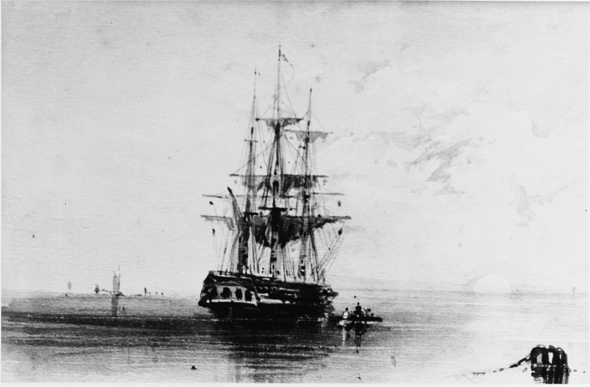 120k | Black and white photo of a water color painting by an unknown artist of Raritan as the flagship of COMO. David Connor during the Mexican War.