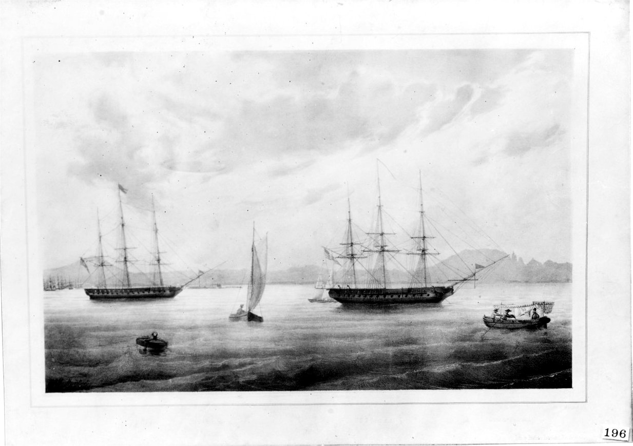 128k | Black and white photo of a lithograph by Martinet of the frigates Raritan and