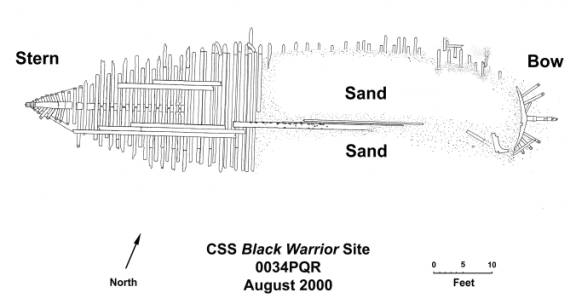 16k | Archaeological line drawing of the CSS Black Warrior ship wreck. Courtesy of North Carolina, Department of Cultural Services. Image from Battle of Elizabeth City |