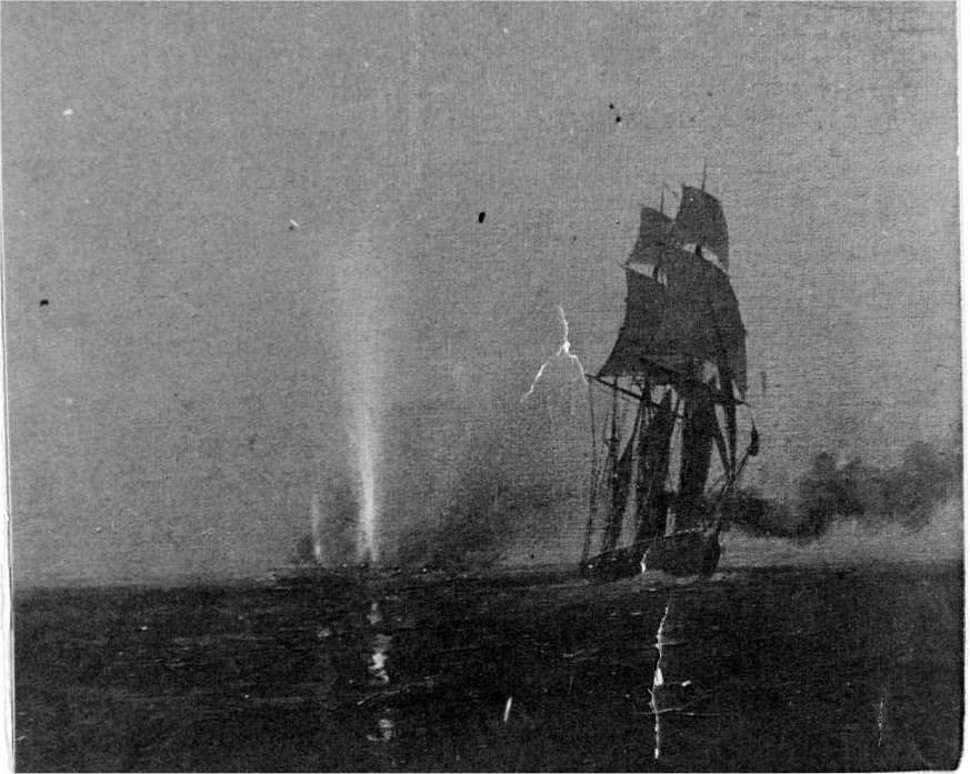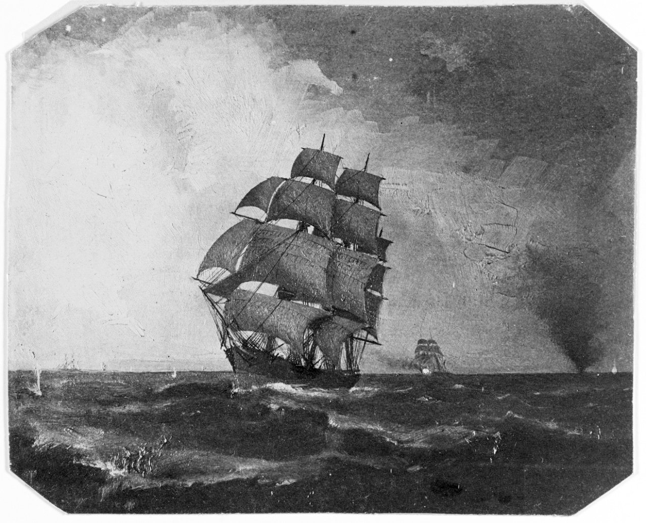 179k | 19th century photo of an artwork of CSS Florida overhauling and capturing the clipper ship Jacob Bell, in the