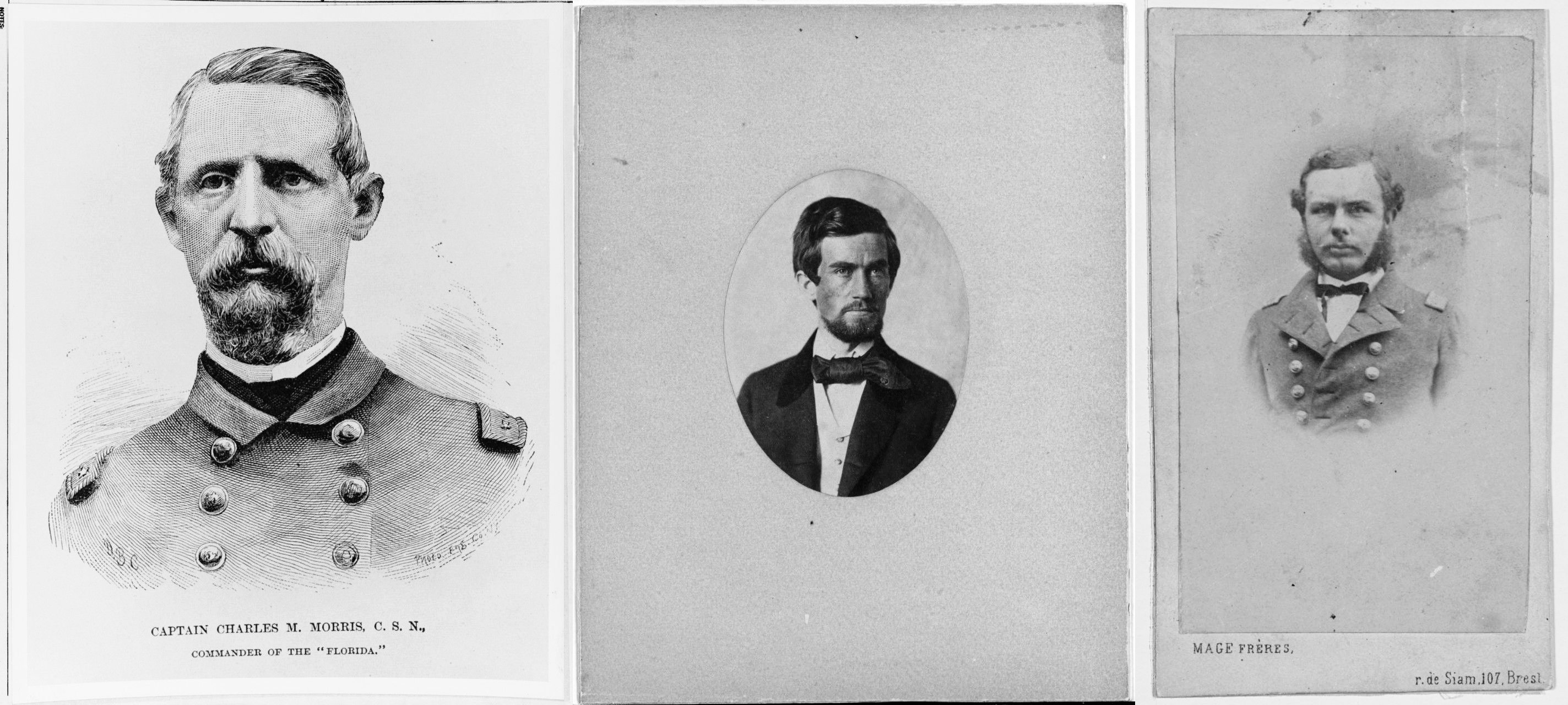 NH 66689 - First Lieutenant Charles Manigault Morris, CSN, last commanding officer of CSS Florida, January-October 1864 NH 47208 - First Lieutenant Thomas K. Porter, CSN, Executive Officer of CSS FLORIDA when seized by USS WACHUSETT at Bahia, Brazil, 7 October 1864. He also served in the Confederate States Army, following service in the US Navy.. NH 44207 - First Lieutenant Sardine Graham Stone, Jr., CSN, served in CSS Florida from 1862 to 1864. Portrait photograph taken by Mage Frères of Brest, France US Naval History and Heritage Command Photo #'s NH 66689, NH 47208, and NH 44207. |