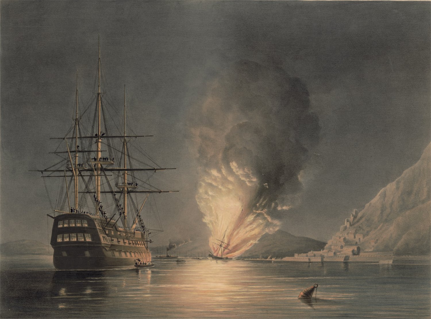 323k | Lithograph "The burning of the United States Steam Frigate Missouri at Gibraltar, Aug. 20, 1843."