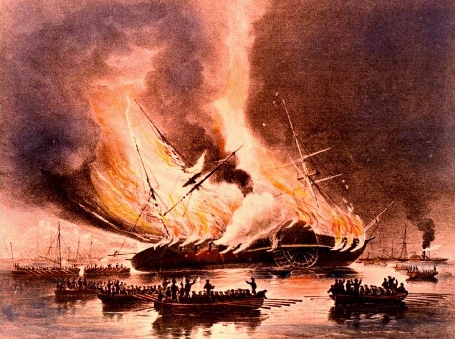 Crew of HMS Malabar (foreground, left) watch as USS Missouri explodes and burns in the distance from accidental fire after completing first trans-Atlantic voyage of a US steam powered ship the day prior. Library of Congresshttp://hdl.loc.gov/loc.pnp/pga.05978 |