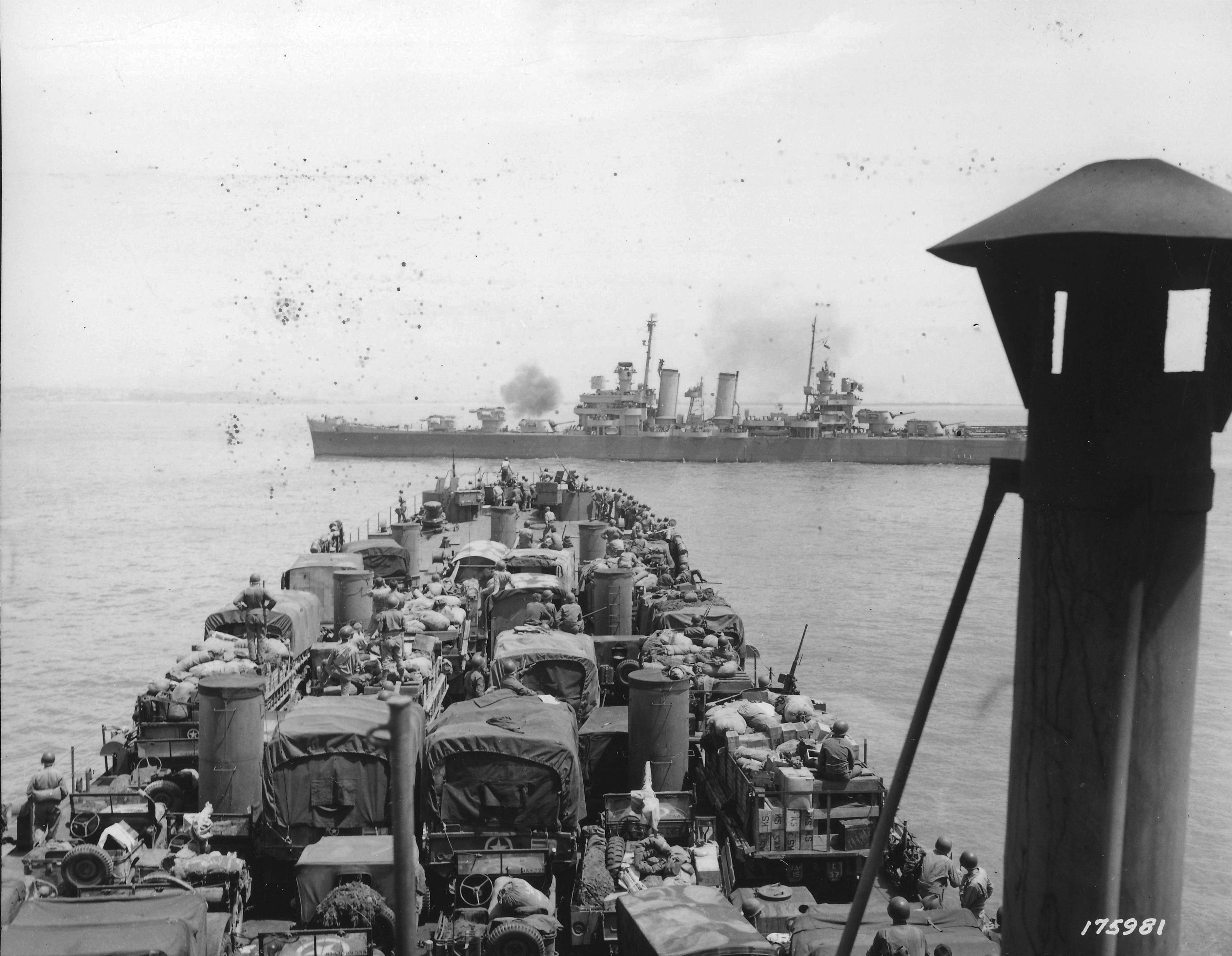 1189k | Sicily Invasion, July 1943. USS Boise (CL-47) fires on enemy forces near Gela, Sicily, 11 July 1943. Photo taken from USS LST-325. Note manned .50 caliber machine guns on several of the Army trucks embarked on the LST's deck, a precaution against German air attack. Morison, "History of U.S. Naval Operations in World War II" (Vol. IX, page 107) states that Boise's targets were enemy tanks. Photo by Sgt Harold Crosnon, USA. Army Signal Corps photo # SC 175981 In the Army Signal Corps Collection US National Archives. |
