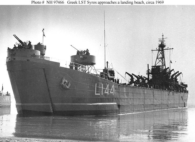 96k | Ex USS LST-325 now in service as the Greek HS Syros (L-144) approaching the beach during a Royal Hellenic Navy amphibious operation, circa 1969. The stern of the LSM HS Ipopliarchos Tournas (L-162), formerly USS LSM-102 is visible at the extreme left. US Navy photo # NH 97466, from the collections of the US Naval Historical Center |
