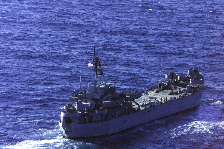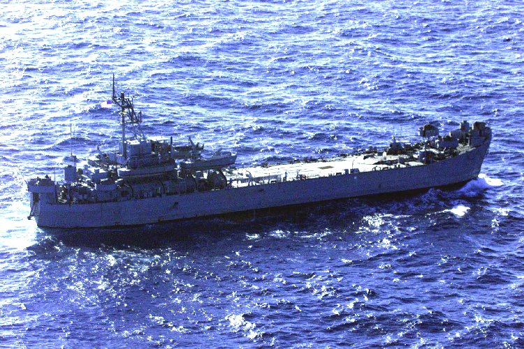 128k | M/V LST-325, ex Syros, seen here mid-voyage from Greece, via Gibraltar and Nassau, to final destination Mobile AL, circa late-2000 to January 2001. Manned by volunteer members of the USS LST Memorial Inc. | Contributed by: Joe Radigan MACM USN Ret Source: Lawrence County (LST-887) web site |