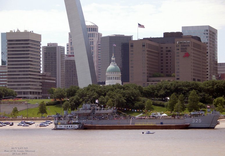 86k | LST-325 starboard beam view moored pierside at St. Louis, MO., 2003 | Photo by Gary D. Bollinger | |