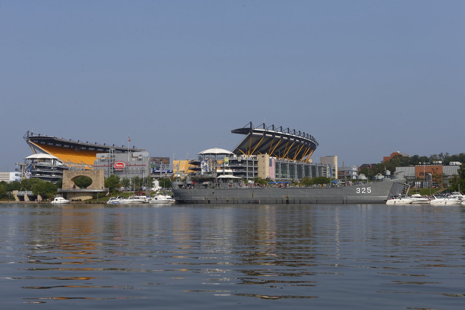 237k | LST 325 moored pierside on the Allegheny River at North Shore, Pittsburhg, PA., 8 September 2015. Note two geese and Heinz Field.
