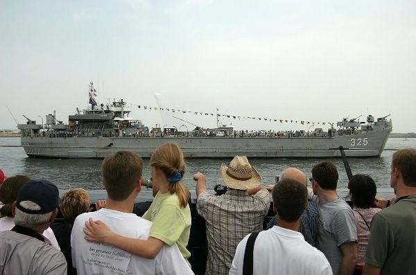 44k | Boston residents watch as LST 325, sails past prior to mooring in Boston Harbor as part of Navy Week Boston, 11 June 2005. US Navy photo # 050611-N-8946D-063 by JO1 Daniel Day. |