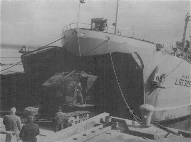 271k | Members of the US Army 834th Engineer Aviation Battalion load equipment aboard USS LST-325 during amphibious