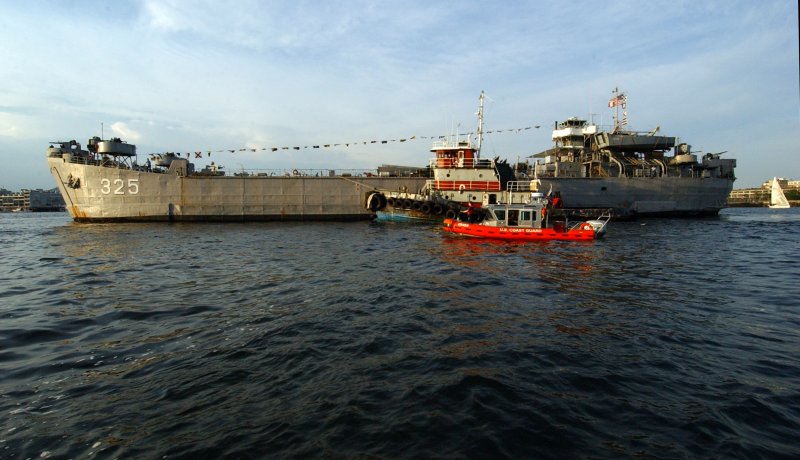 76k | LST-325 arrives in the Boston Harbor escorted by the Coast Guard. LST-325 participated in the 63rd Annual WWII Commemoration Ceremony, designed to give WWII veterans a chance to reunite with their shipmates and receive recognition for their courage and patronage. While at Boston LST-325 was open for tours through June 20, 2005. US Coast Guard photo # 050609-C-4938N-312 Boston, Mass. (June 9, 2005) by Public Affairs Specialist 3rd Class Kelly Newlin. |