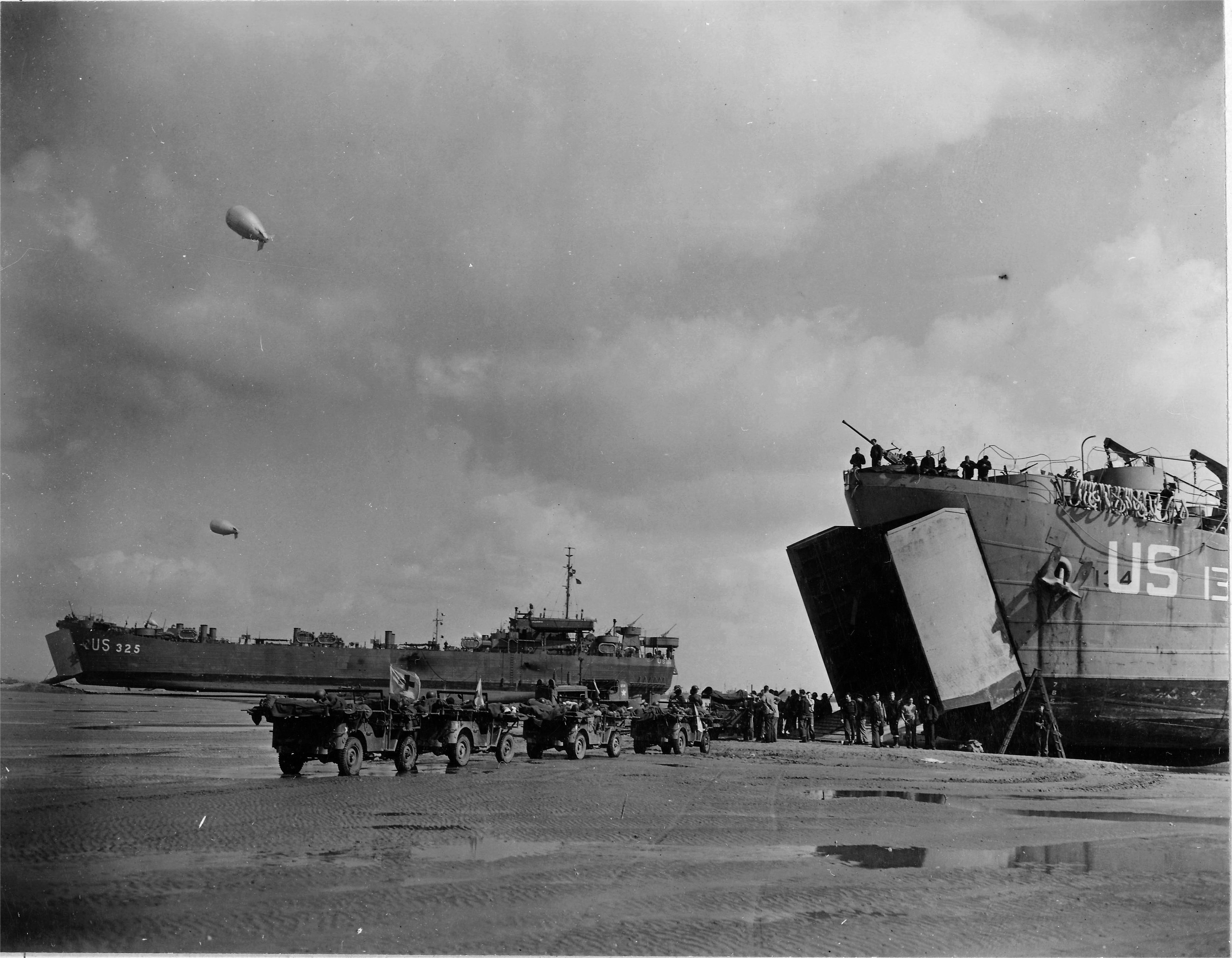 unloads on a Normandy beach at low tide, 12 June 1944. Note barrage balloon overhead. US National Archives photo # 80-G-252796, taken by US Army Signal Corps. Combat Photo Unit Eight (CPU-8), now in the collections of the US Naval History and Heritage Command. |