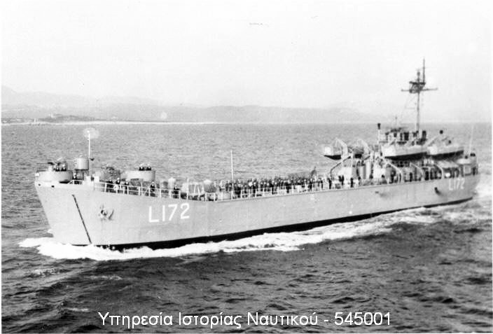 57k | Ex-Boone County (LST-389) in Greek service as HS Lesbos (L-172) underway, date and location unknown. Official Hellenic Navy photo |
