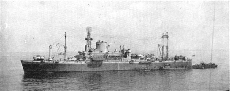 Evident signs of her conversion are the guns forward and aft and the air search radar antenna placed, unusually, at the fore end of the ship's funnel. US Navy Bureau of Ships photo and text from "U.S. Amphibious Ships and Craft: An Illustrated Design History" by Norman Friedman. |