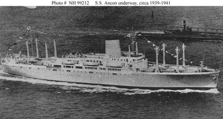 72k | Pre-WWII image of SS Ancon under way, circa 1939-1941, location unknown. US Navy photo # NH 99212, a US Navy photo from the collections of the US Naval Historical Center. |