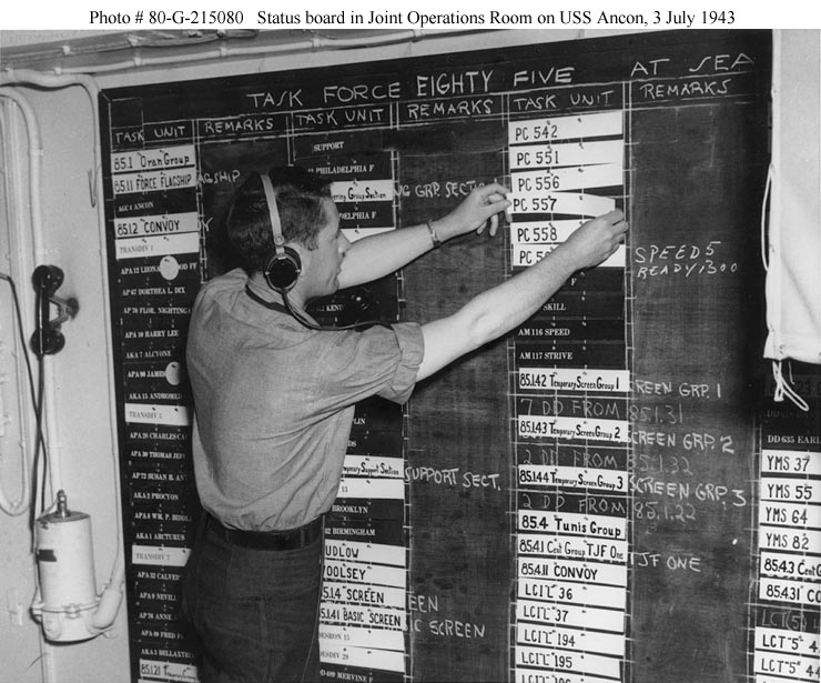 108k | Status board in the Joint Operations Room, USS Ancon (AGC-4), 3 July 1943.