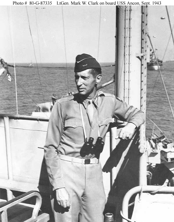55k | Lieutenant General Mark W. Clark, U.S. Army, Commanding General, Fifth Army, on board USS Ancon (AGC-4) during the landings at Salerno, Italy, 12 September 1943. US National Archives photo # 80-G-87335, a US Navy photo now in the collections of the US National Archives. |