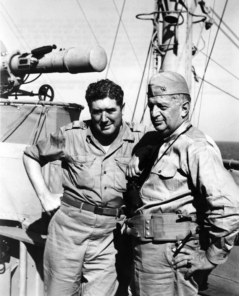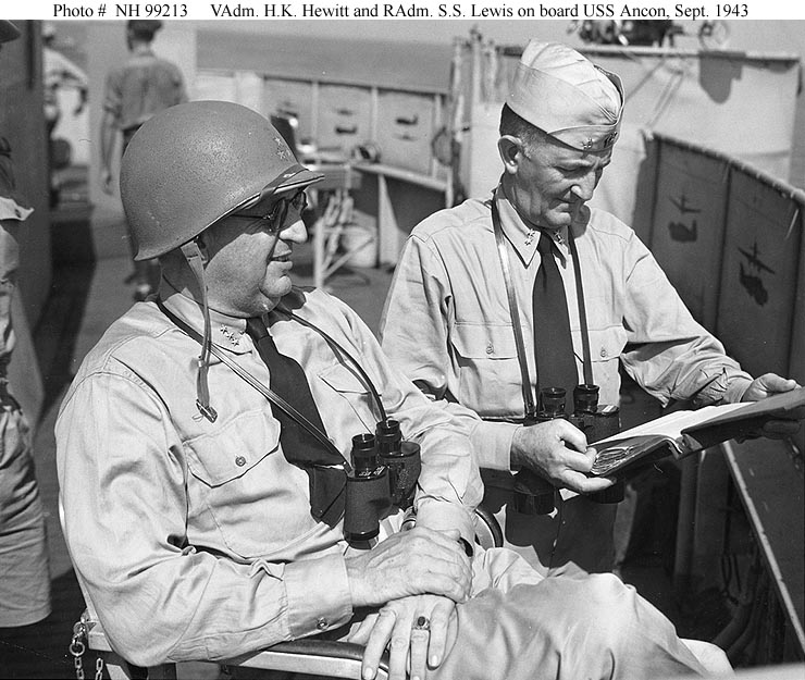 179k | Vice Admiral H. Kent Hewitt, USN (right), who commanded American naval forces during the invasions of Morocco, Sicily, and Salerno, on the deck of his flagship, USS Ancon (AGC-4), with war correspondent Quentin Reynolds. US Navy photo now in the collections of the US National Archives. |
